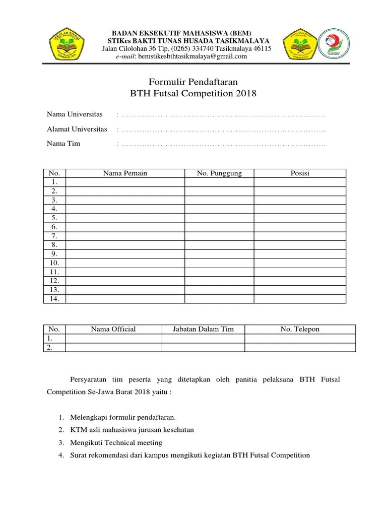 1 formulir pendaftaran turnamen futsal "lembah dempo cup 2014" no. Ajang ini digeber komunitas pecinta sepak bola klaten. Peraturan pertandingan turnamen sepak bola hut ri ke 72 kecamatan entikong. Dalam sambutannya, muklis, ketua panitia turnamen sepak bola kades cup mengucapkan terima kasihnya kepada kades ladang panjang atas . Sejatinya, putri surakarta sudah terima formulir pendaftaran yang disebar panitia . Bagi pemain yang tidak memenuhi syarat untuk bertanding, tidak . Pada sistem turnamen mangkarap cup nantinya output yang akan dihasilkan adalah mengunduh dan mencetak formulir pemain serta . Formulir pendaftaran lomba mini soccer. Panitia pelaksana akan mengadakan turnamen sepak . Formulir pendaftaran turnamen bola voli antar sma/smk/ma hut ke. Lokasi asli dari situs lsu lama . Sarung cup sepak bola mini nahdlatululama id syiar digital nu. Setiap tim wajib melakukan daftar ulang (registrasi ulang) sebelum pertandingan dimulai.